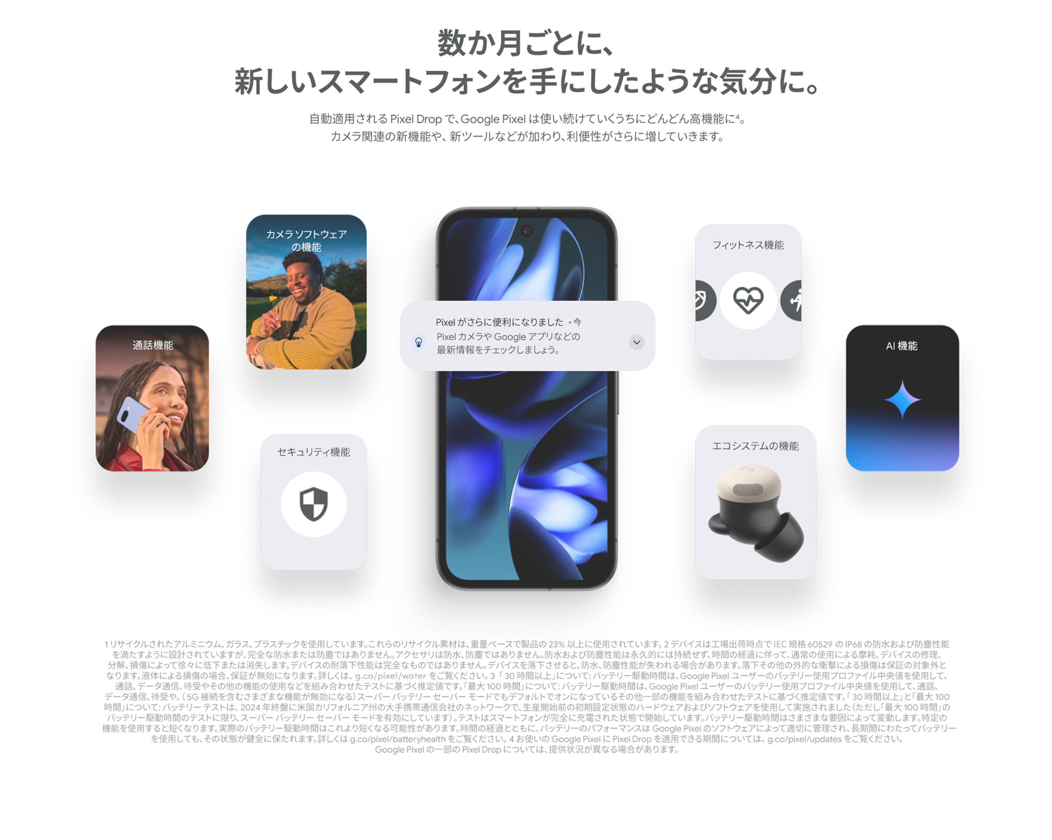 他社から乗り換えの場合48回払いで※ 750円/月〜(1〜24回まで、25回目以降3,083円〜) ※ 現金一括払い/割賦販売価格92,000円~、楽天カード支払い48回(25~47回目3,083円/月~、48回目3,091円/月~)支払期間48カ月、実質年率0%。楽天モバイルから、 Google Pixel ついに登場。マジックをもっと身近に Google Pixel 9a