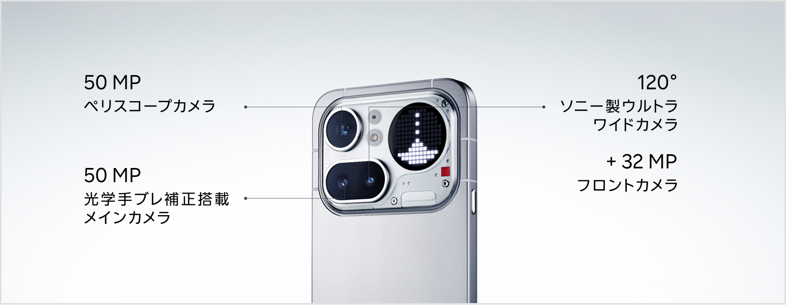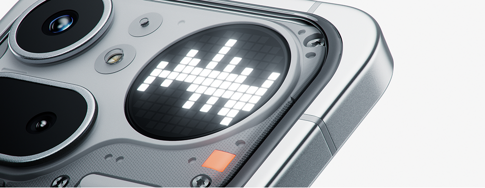 背面のGlyphマトリックスが、大切な通知をひと目でわかるようにお知らせします。スクリーンを下に向けて置いておけるので、気が散ることが減るでしょう。Glyphマトリックスには、タイマーやセルフィーミラーなど便利な機能もついています。