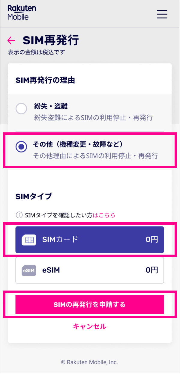 SIM再発行の画面が表示されます。「その他(機種変更・故障など)」「SIMカード」をタップして「SIMの再発行を申請する」ボタンをタップしてください。