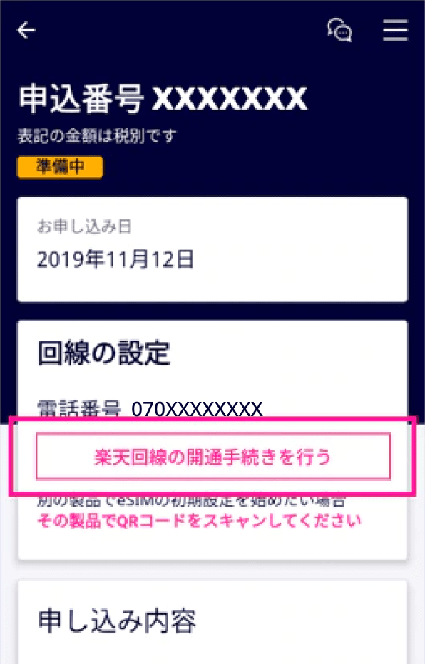 my 楽天モバイルにログイン後、以下の画面が表示されます。「申込番号」エリアをタップしてください。